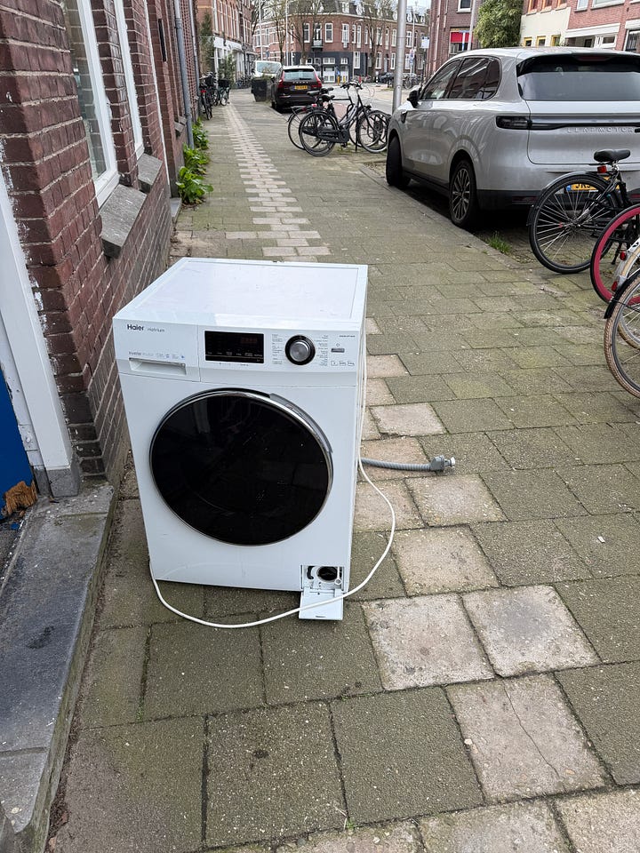 Mijn jas zat onder het stof en er waren druppels water in mijn gezicht gekomen uit een van de grijze wasmachine-slangen. Ik zwaaide de vrolijke man, die inmiddels nog vrolijker leek, uit en liep naar huis. Terwijl ik het stof van mijn jas klopte en me een heel goed mens voelde door een willekeurige man geholpen te hebben met een kutklusje, dacht ik: het gebeurt niet vaak dat er iets gebeurt tijdens een wandeling over de Willem van Noortstraat, dit gaat op substack.